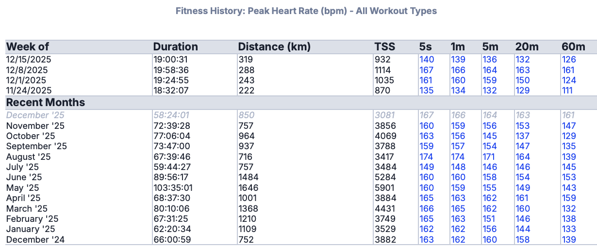 60 minute column: My highest number for 2025 is during December’s half marathon race (161 bpm). There is little reason to take the risk, and generate the fatigue, from a true 60-minute max in an Ironman-focused year.